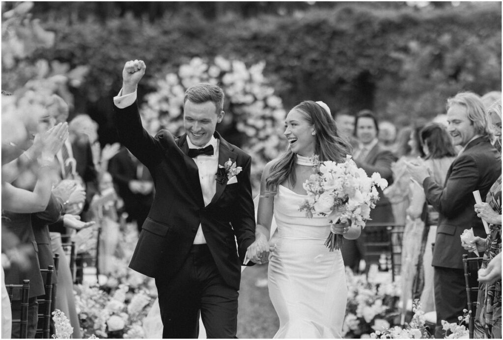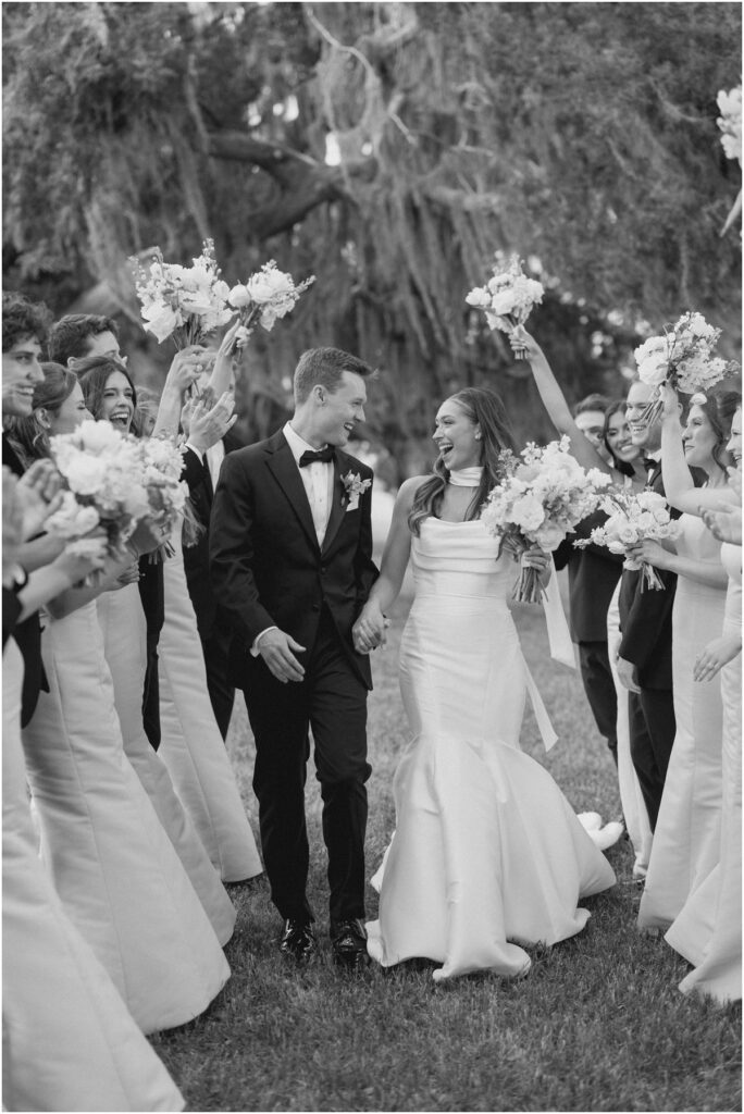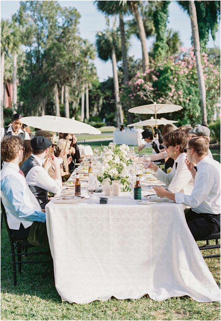 Their ceremony took place in the manicured gardens of Crane Cottage, with buttery florals lining the aisle and a lush floral arch framing their vows. The palette was soft and romantic, allowing the natural beauty of Jekyll Island to shine while still feeling editorial and elevated.